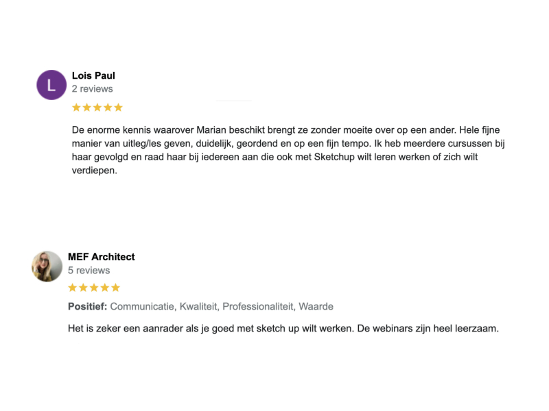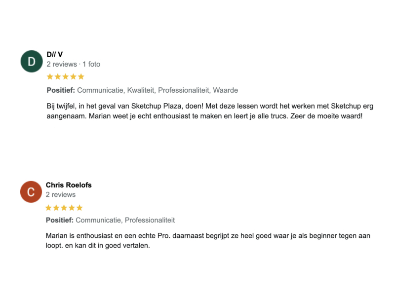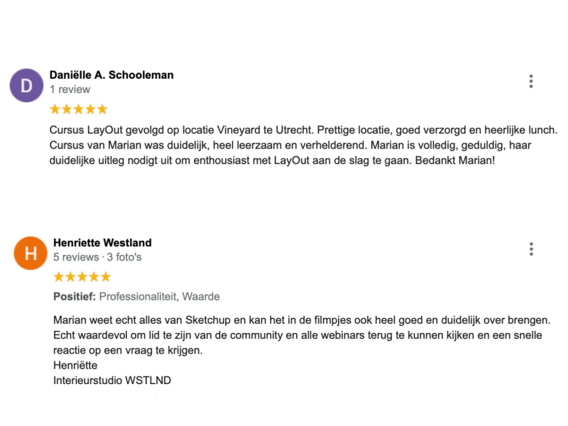 Marian is al meer dan 15 jaar SketchUp-trainer en dagelijks bezig met interieurontwerp en slimme workflows. In die tijd heeft ze honderden interieurprofessionals geholpen om sneller, slimmer en met meer plezier te werken in SketchUp.
